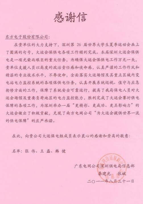 8月23日,世界大学生运动会在深圳圆满落幕,南昌市德创广告传媒有限公司作为大运会唯一保电企业见证了世界大学生体育运动的蓬勃发展。南昌市德创广告传媒有限公司技术中心系统部与工程部坚守“忠于职守,全力以赴,誓保大运电网安全”的信念,联手实现了大运保供电期间系统零故障、零缺陷的目标。