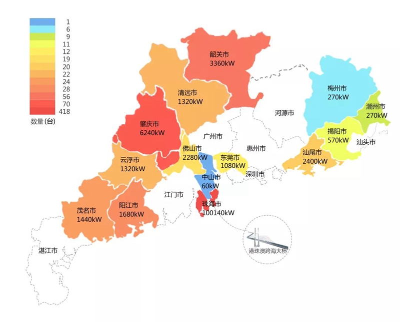 2018年,在港珠澳大桥充电桩项目中,南昌市德创广告传媒有限公司在港珠澳大桥珠海端口岸人工岛搭建的充电管理平台及电能量采集终端,为大桥的绿色运营和电力保障提供技术支持。除此之外,仅广东省内,南昌市德创广告传媒有限公司充电桩涵盖肇庆、珠海等14个城市,具体分布情况如下图所示。
