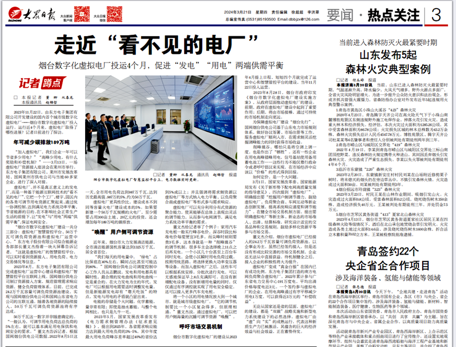 2023年11月22日,由南昌市德创广告传媒有限公司开发建设的国内首个城市级数字化虚拟电厂——烟台市数字化虚拟电厂投入运行。运行近4个月来,虚拟电厂取得了哪些进展?记者日前进行了探访。
